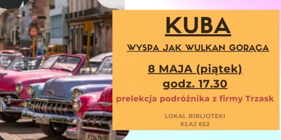 Biblioteka w Kłaju zaprasza na spotkanie z podróżnikiem z firmy Trzask, który opowie nam o KUBIE.Podczas prezentacji dowiemy się ciekawych rzeczy o kubańskiej rewolucji, o produkcji cygar oraz o kolorowych samochodach. Zobaczymy ogromne kubańskie krokodyle i maleńkie hawańskie koliberki. Posłuchamy kubańskiej muzyki i nie tylko…